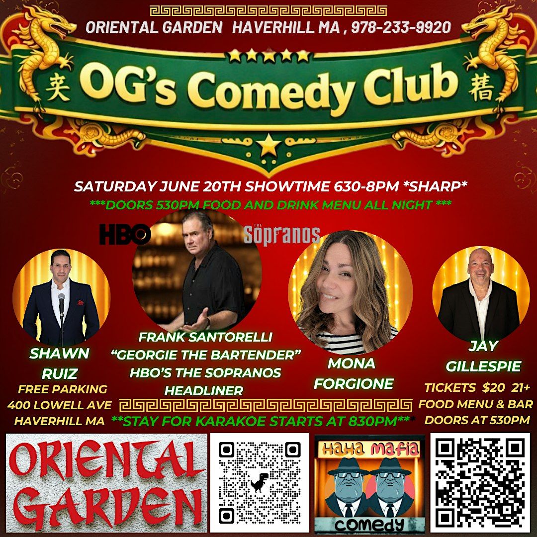 Join us at OG's Comedy Club located inside the Oriental Garden in Haverhill, MA. It's gonna be a night full of laughs, good vibes, and unforgettable fun. Don’t miss your chance to be part of the comedy scene as we kick things off in style. Bring your friends and let’s make it a night to remember! Bringing Boston and New England's Best and favorite comedians to Haverhill MA. Easy free Parking , less than 1/2 mile off exit 107 on 495 .... Great Food and Drinks , doors open at 530Pm for dinner , stay after the show for Karaoke .