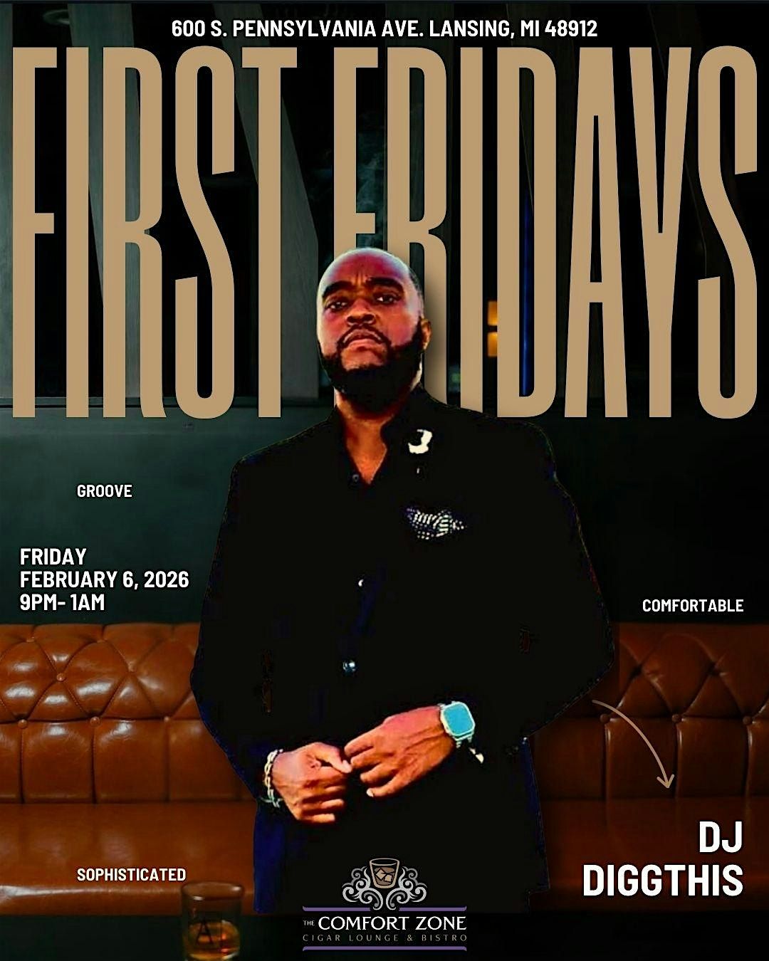 Welcome to Comfort Zone First Fridays featuring the one and only DJ DiggThis! Join us at The Comfort Zone Cigar Lounge & Bistro for a night of great music, good vibes, and awesome company. Get ready to dance, relax, and enjoy some top-notch tunes in a cozy atmosphere. Don't miss out on the fun - mark your calendars for the first Friday of the month and come hang out with us!