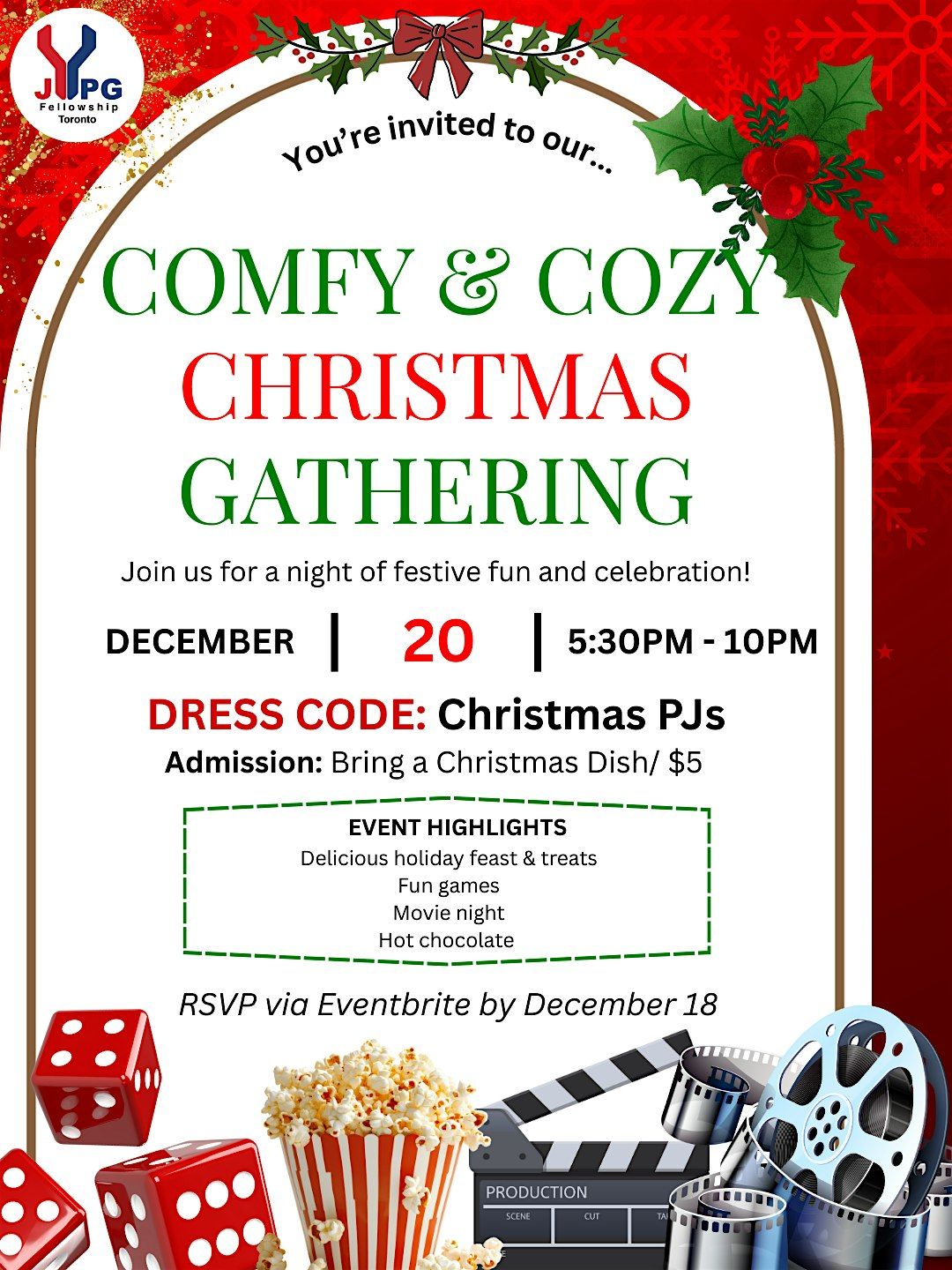 Join us for a festive evening filled with holiday cheer! Join us for a festive Christmas Gathering and Movie Night! We'll kick off the holiday fun with great music, food, fun activities, and a Christmas film - all in the comfort of your holiday pajamas.