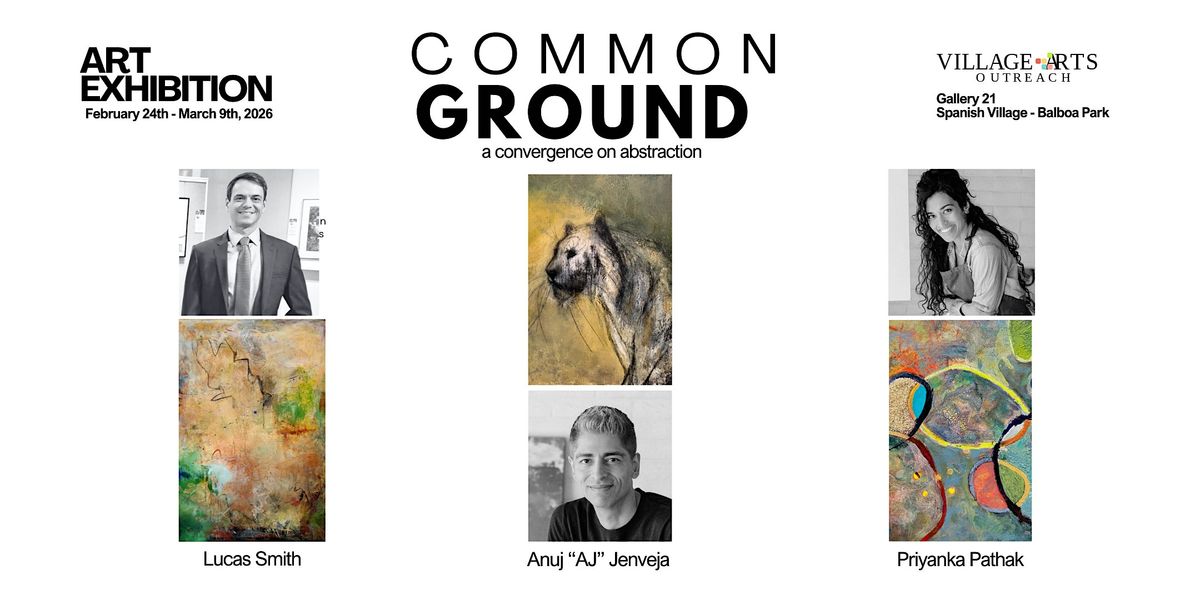The “Common Ground” exhibition showcases the highly acclaimed work of San Diego artists Lucas Smith, Anuj "AJ" Jenveja, and Priyanka Pathak in a curated group exhibition at Village Arts Outreach (aka Gallery 21) in Spanish Village, Balboa Park.
