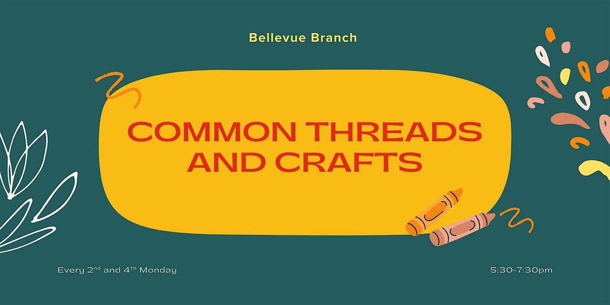 Welcome to Common Threads and Crafts at the Bellevue Branch Library on the second and fourth Monday of every month from 5:30-7:30pm! Come join a welcoming community of crafters and makers of all skill levels dedicated to sharing their knowledge. Bring your own project to work on and see you there!