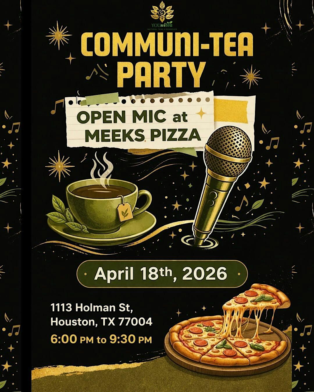 Join the Communi-Tea Party Open Mic Night at Meeks Vegan Pizza!