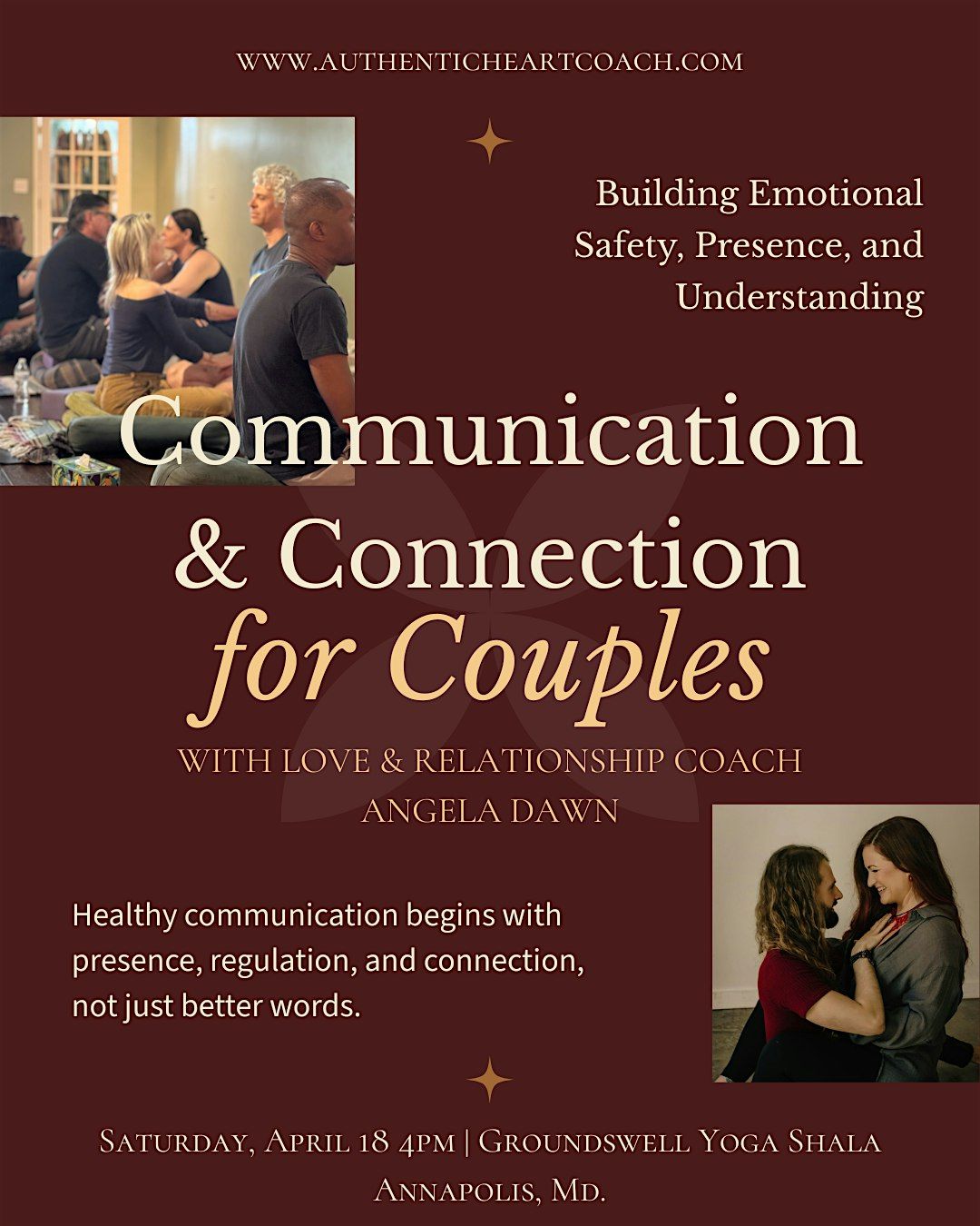 Communication & Connection for Couples is an experiential workshop designed to help partners deepen understanding, reduce reactivity, and reconnect through conscious communication and embodied connection.