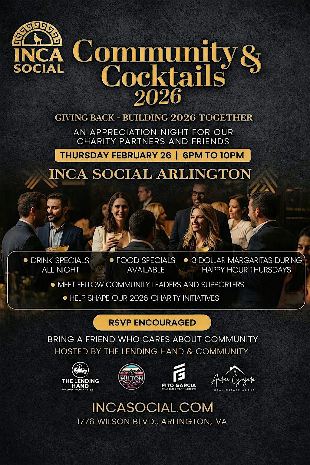 Join us for Community and Cocktails, a special networking evening hosted at Inca Social Arlington, created to bring together the incredible organizations, partners, and individuals who worked with us throughout 2025 on charity events and community initiatives.