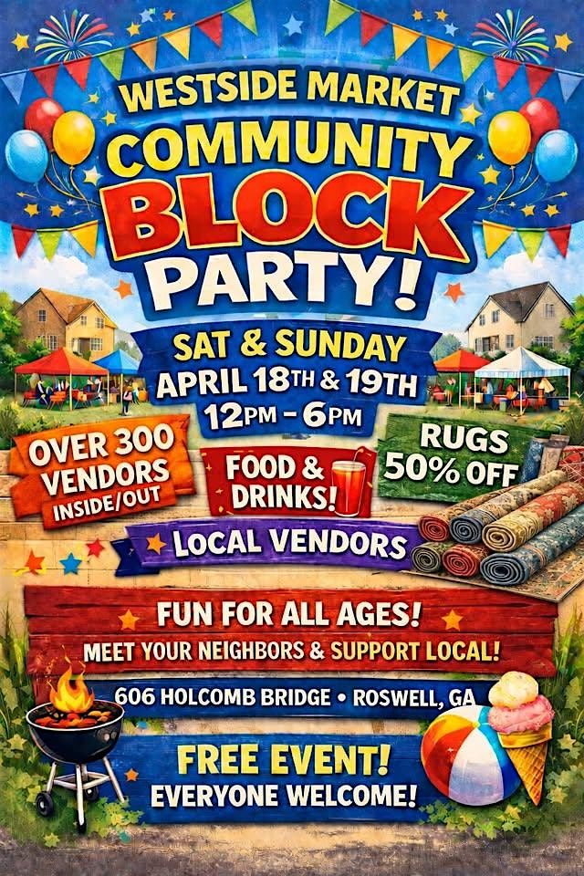 Join us for a fun-filled, in-person community block party hosted by JAlexander Publishing and Westside Market Roswell! Meet neighbors, enjoy great vibes, and celebrate local culture. Whether you're here to mingle, explore unique finds, or just have a blast, this event’s the place to be. Don't miss out on the good times and awesome people!