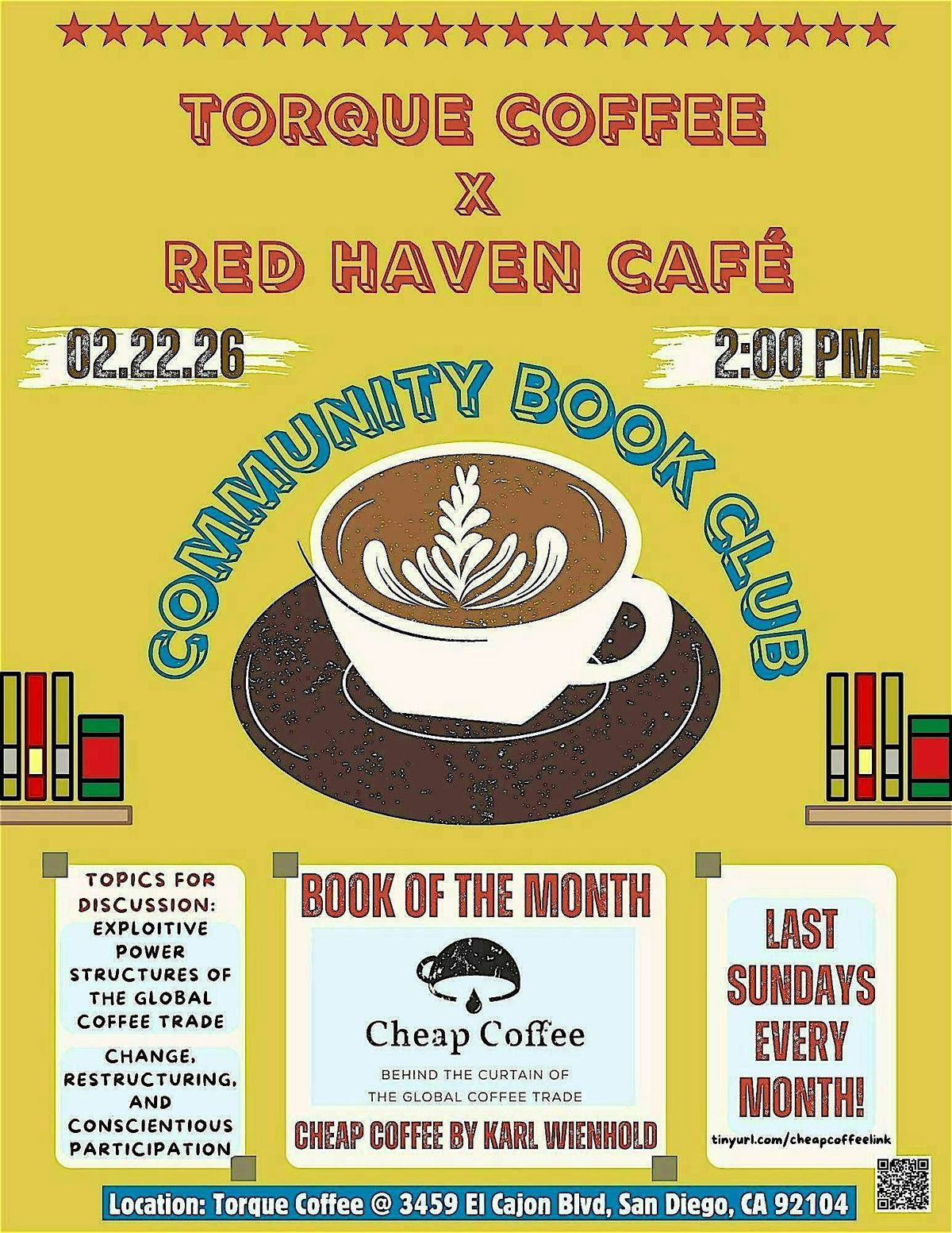 Torque Coffee x Red Haven Cafe Community Book Club Series! Book of the month: Cheap Coffee by Karl Wienhold. Last Sunday of every month
