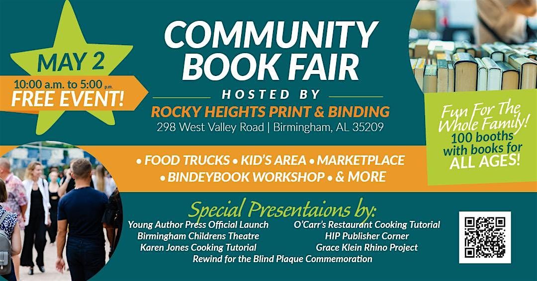 This bookfair will include over 100 authors and author-adjacent vendors all in one location! All genres of books will be represented and there will be a marketplace geared toward book lovers. In addition to all the books, there will be workshops for young authors and speaking panels with authors, publishers and book printers. The main stage will host Q&A sessions with writers, publishers, graphic designers and book marketers. Grace Klein will present their children-focused Rhino project and Rocky Heights Print and Binding will present the official rollout of the Young Author Press. Rewind for the Blind will do a special presentation for Charley Boswell's (Champion Blind Veteran Pro Golpher) reprinting of his book Now I See. Our top selling recipe book authors will showcase their favorite recipes in a sponsored kitchen stage. Additional partners on site that day will be Huntsville Independent Press (HIP), Alabama Literacy Assoc, Ikidd book company, and Alabama Writers Cooperative. There will be so much for everyone to enjoy!
