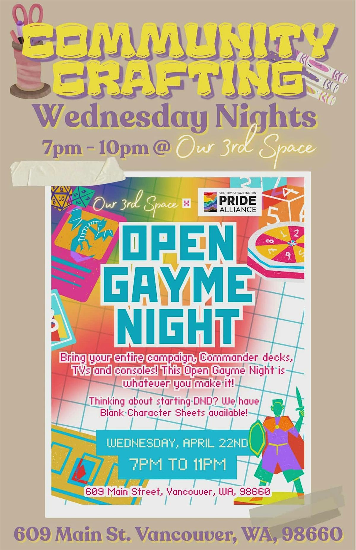 Community Crafting Wednesday Nights: Open Gayme Night At Our Third Space