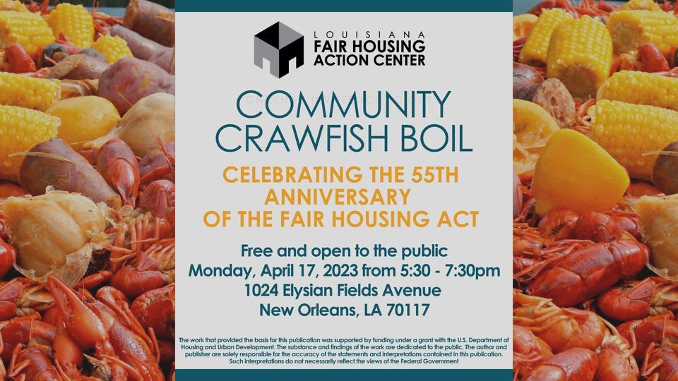 LaFHAC welcomes you back to our annual free community crawfish boil! Join us on Monday, April 17th from 5:30pm - 7:30pm to commemorate the 55th anniversary of the Fair Housing Act with a fresh plate of crawfish.Location:
