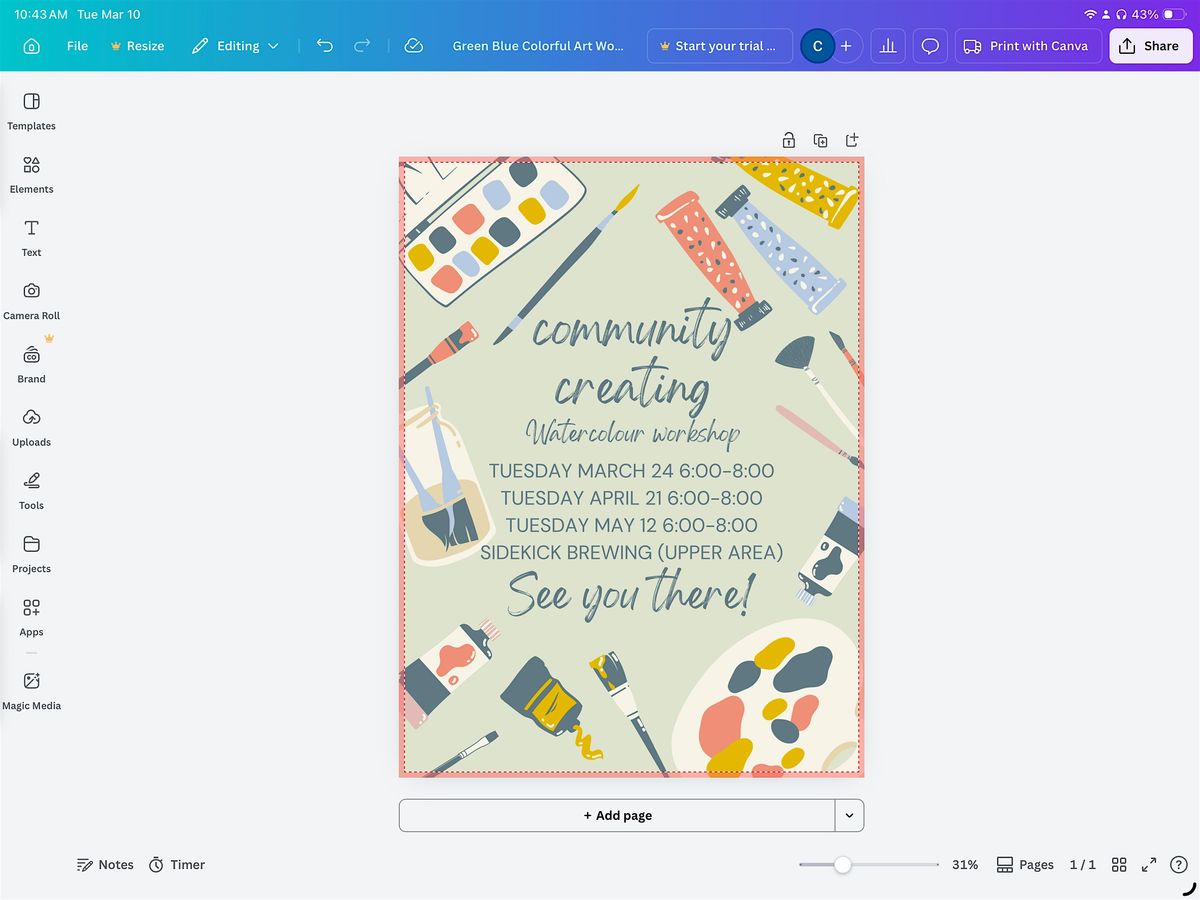 This gathering will be held on the upper seating area of Sidekick Brewing which is unfortunately not wheelchair accessible (my apologies, and if this affects your ability to attend please reach out and I would love to arrange a class that is accessible for you!). I've partnered with Sidekick Brewing to support this amazing local business- I would highly recommend you try their delicious drinks and food! All supplies will be provided, please arrive a couple minutes early as the class will start promptly at 6:00. During this workshop we will start with an activity that introduces you to the medium of watercolour, allowing you to get comfortable with its properties. We will then explore different techniques to create texture, blending colours and playing with patterns. Combining these elements we will have the opportunity to create a final piece of art. Everyone's will be unique, so if there is something you have in mind for inspiration please collect images and bring them on your phone. This class is an exploration of art as play, where we remove our expectation of what the finished piece will look like and instead embrace the letting go and childlike wonder of art making.