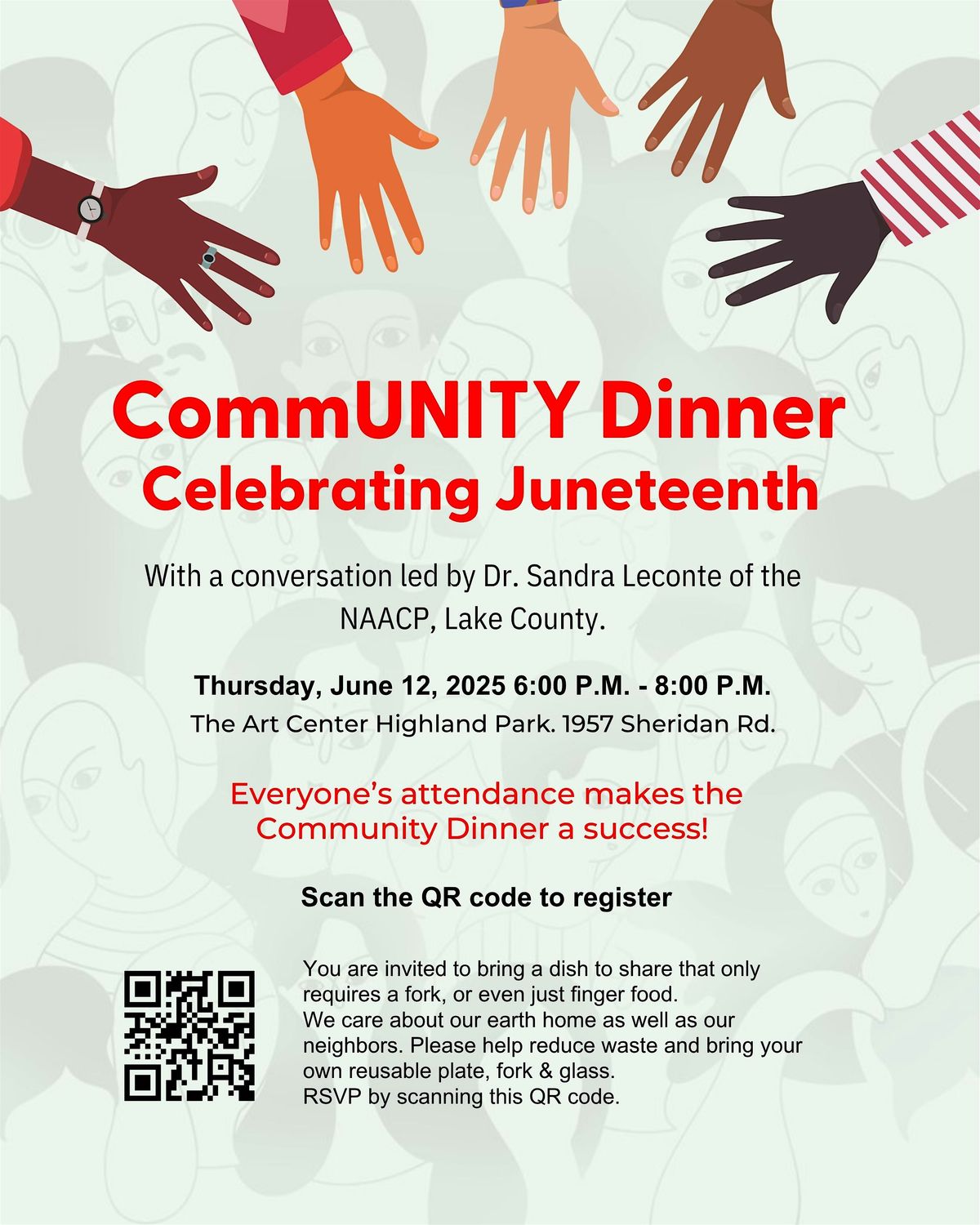 Program follows Conversation and Potluck Dinner Program Follows, Conclusion 8:00 P.M. The Art Center Highland Park.1957 Sheridan Rd. Everyone’s attendance makes The Community Dinner a success! Please register below.