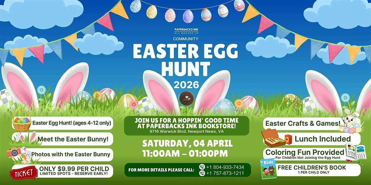 Hey there! Join us for a fun-filled Community Easter Egg Hunt at Paperbacks Ink on April 4, 2026 at 11:00 AM (Eastern Time). Bring your friends and family for an exciting day of egg hunting, laughs, and good vibes. Don’t miss out on this awesome chance to celebrate and connect with your community in a relaxed, friendly setting. See you there!