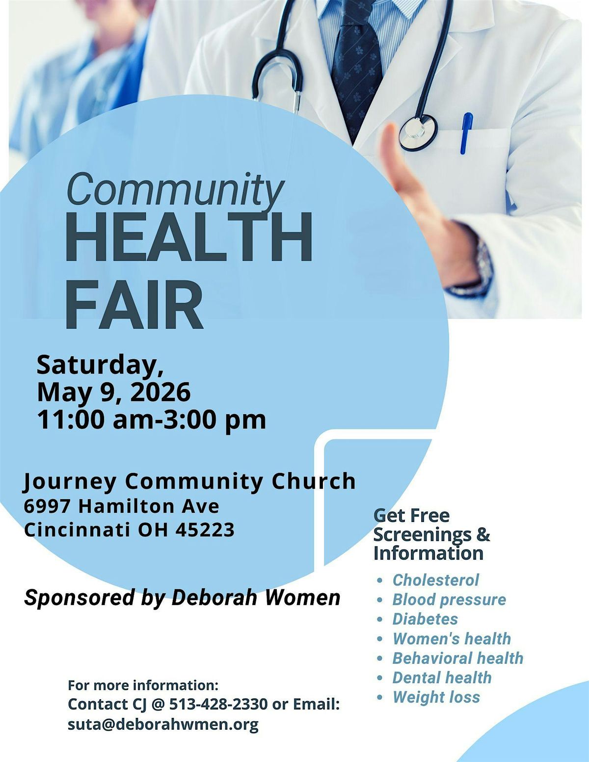 Join us for a life-changing Community Health Fair hosted by Deborah Women—a day dedicated to empowering you and your family with vital health resources. Enjoy free screenings for cholesterol, blood pressure, diabetes, dental, behavioral, and women’s health, plus information on weight management and wellness. This welcoming event connects you with caring professionals—no insurance required. Take a proactive step toward better health. Get informed, stay encouraged, and build a stronger community together. Bring your loved ones and experience hope, care, and support. All ages are welcome, and services are provided in a friendly, judgment-free environment focused on your total well-being. Walk in, ask questions, and leave empowered with knowledge and next steps for healthier living today for your future.