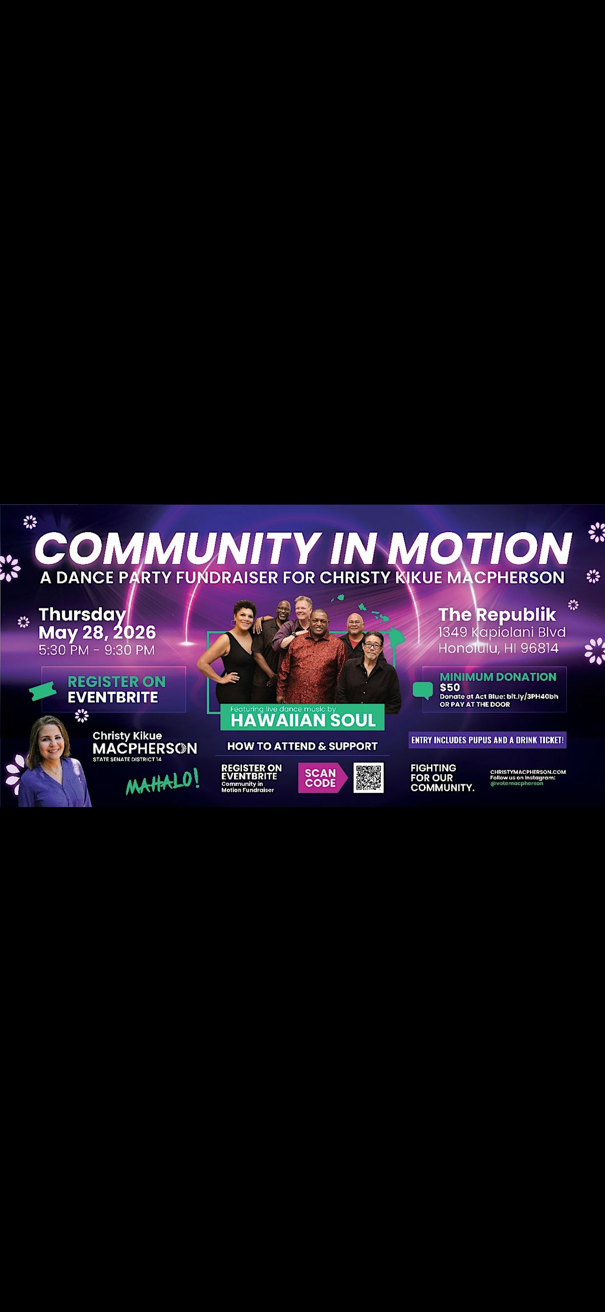Get out your dancing shoes and kick off summer at the Community in Motion fundraiser! This fun, in-person event is all about connection, good vibes, and supporting Christy's candidacy for State Senate District 14! Come and unwind, let loose, and boogie to live music by Hawaiian Soul, Hawaiʻi's premier R&B band! See you on the dance floor!