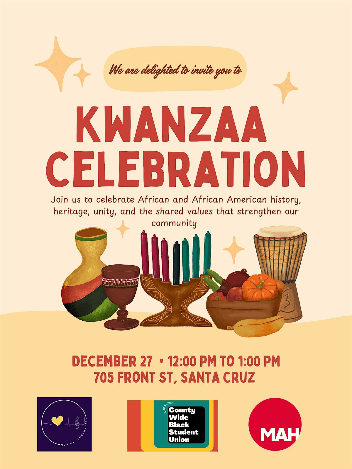 Join us! The MAH, Musical Soulmates and Countywide Black Student Union invite you to a Community Kwanzaa on Day 2 of Kwanzaa: Kujichagulia (Self Determination). All are welcome to enjoy the celebration which includes uplifting music, remarks by local dignitaries, and candle lighting. It's a warm, welcoming atmosphere, a chance to learn about the holiday created to celebrate and honor African and African Amercian heritage and unity. Don't miss out on this intergenerational collaboration for all at Santa Cruz' cultural hub: the MAH: where community spirit shines bright!