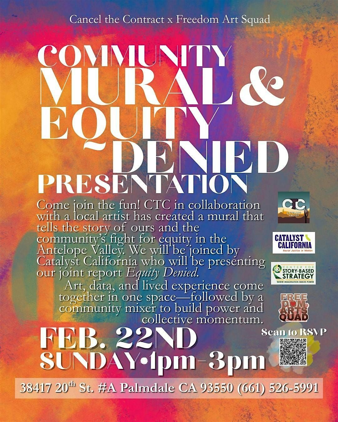 Come join the fun! CTC in collaboration with a local artist has created a mural that tells the story of ours and the community’s fight for equity in the Antelope Valley. We will be joined by Catalyst California who will be presenting our joint report Equity Denied. Art, data, and lived experience come together in one space—followed by a community mixer to build power and collective momentum.