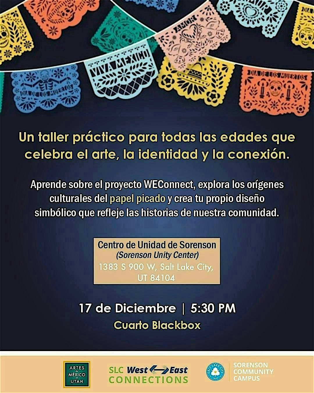 Salt Lake City and Artes de Mexico en Utah invite the community to help us design an installation of the traditional Mexican craft of papel picado for the West-East Connections (WEConnect) project. This will be a hands-on workshop for all ages celebrating art, identity, and connection.Join us at Sorenson Unity Center Black Box Theater (1383 S. 900 West, Salt Lake City) on Wednesday, December 17, from 5:30 – 7:30, to learn about this project, explore the cultural origins of papel picado, and create papel picado designs that reflect the story of Salt Lake City’s reconnection of the west and east sides of the city.Salt Lake City’s westside neighborhoods are physically separated from eastern parts of the city, including downtown, by Interstate 15 and several major railroad tracks. Westside residents are affected every day by parked trains, which cause delays, longer travel times, and safety concerns for all users..The WEConnect study will identify and prioritize infrastructure, policy, and program solutions to improve west-east connectivity across the divide. We want those most affected by the divide to help shape the solutions – and the City is broadening its civic engagement by working with a team of artists and art organizations like Artes de Mexico en Utah to help the community explore ways to overcome the divide.Collaborate with us to tell the stories of the community on both sides of the divide and your hopes and visions for reconnection. Learn from Artes de Mexico en Utah about the craft of papel picado, in which squares of papel (“paper”) are picado (“pecked” or “cut”) with unique and often intricate designs and hung on strings in spaces of celebration.The community’s designs will be incorporated into a papel picado installation along the 900 South 9 Line on both the west and east sides to bring attention to to the divide and opportunities for the community to help develop solutions to reconnect us.For more information on WEConnect, please see https://www.slc.gov/transportation/plans-studies/west-east-connections/ or send us an email at [email protected] out more about Artes de Mexico en Utah at artesmexut.org