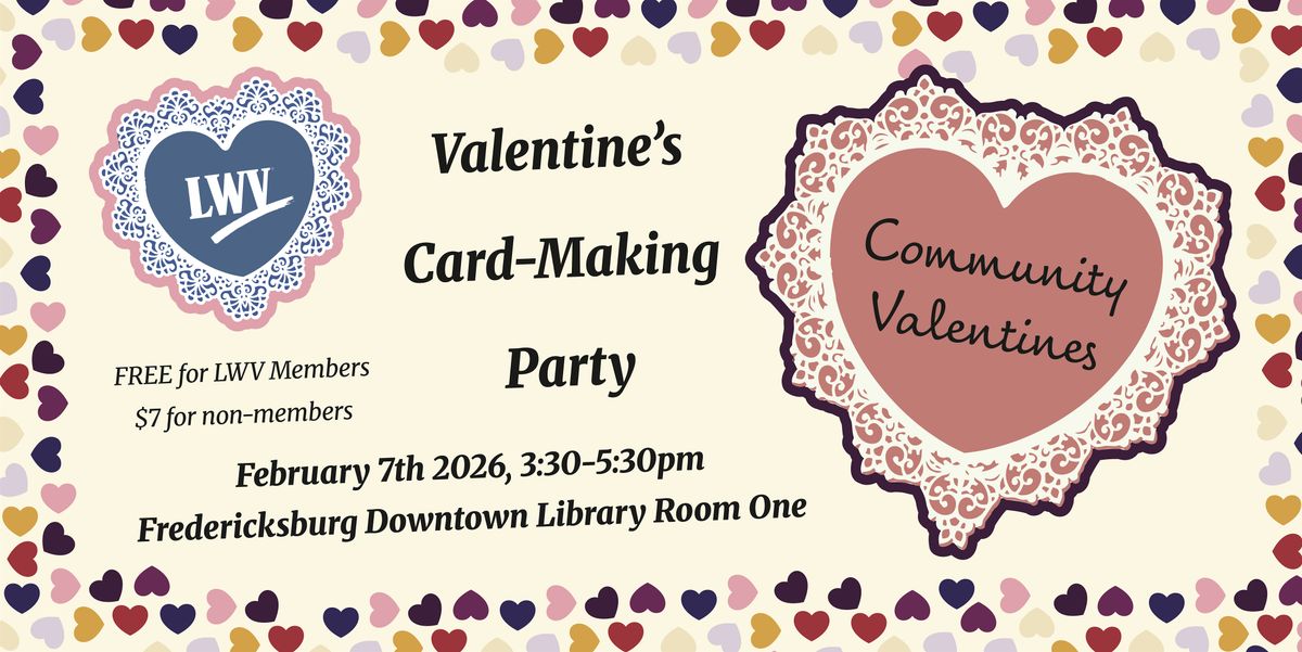 Join the League of Women Voters of the Fredericksburg Area for a relaxed, family-friendly Valentine’s card-making event. This is a low-stress, drop-in creative space where neighbors of all ages can make handmade cards, connect, and enjoy time together. All materials are provided and no experience is needed. Make a card for a friend or loved one—or we can help direct your card to a community member who would appreciate an extra greeting.