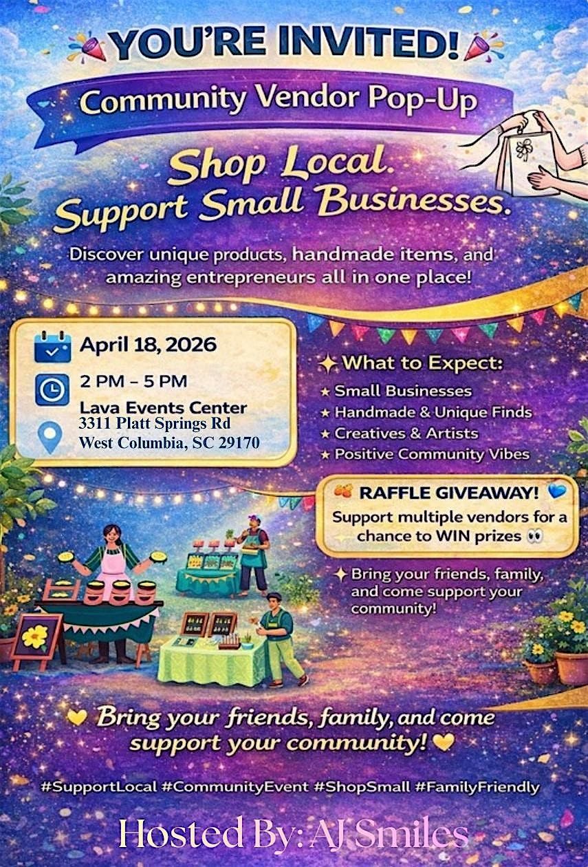 Hey there! Join us for a super fun day at the Community Vendor Pop-Up. It's all happening in person, so come hang out, meet awesome local vendors, and discover unique finds. Whether you're looking for cool crafts, tasty treats, or just wanna soak up the good vibes, this event’s got you covered. Don’t miss out on the chance to support your community and have a blast!