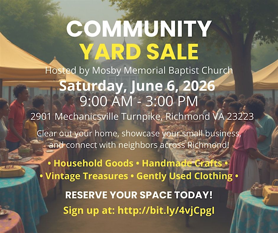 Join us at Mosby Memorial Baptist Church for a fun and casual Community Yard Sale! It’s happening on June 6, 2026 at 9:00 AM (Eastern Time). Come find great deals, meet neighbors, and enjoy a relaxed morning out. Whether you're looking to buy, sell, or just browse, there's something for everyone. Don’t miss out on this awesome chance to connect and score some treasures! Food trucks will be available!