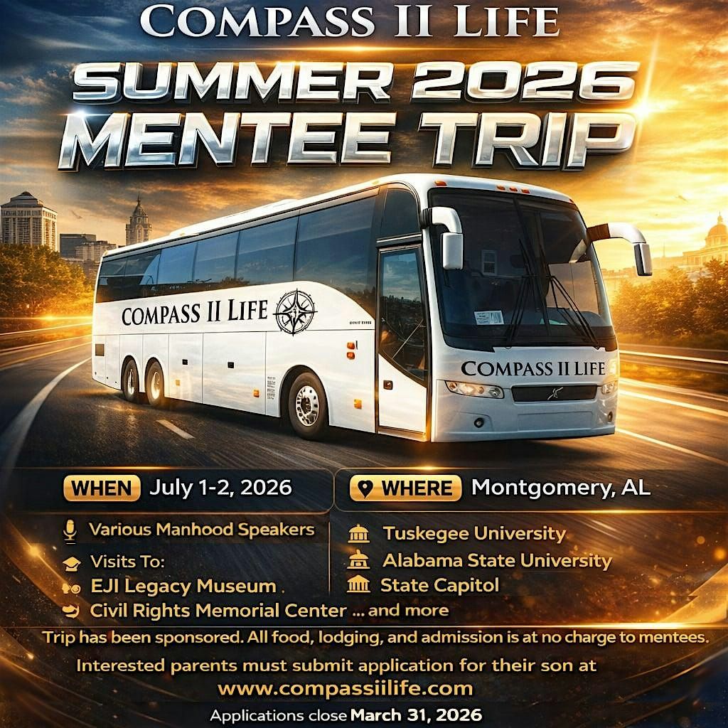 Mentee Information: Get ready for an awesome trip this summer. The Compass II Life (2026) summer educational trip will be all about fun, exposure, and learning. Join us for exciting activities with other Compass II Life mentees and a chance to grow and better prepare for a successful future as a young man. The trip will include multiple speakers and tours.