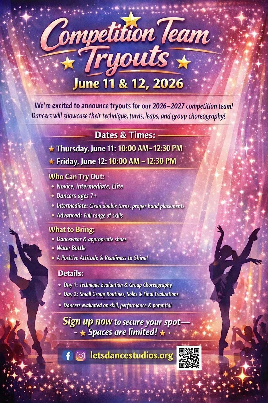 Join us June 11–12 from 10:00 AM–12:30 PM for our 2026–2027 Competition Team Tryouts!