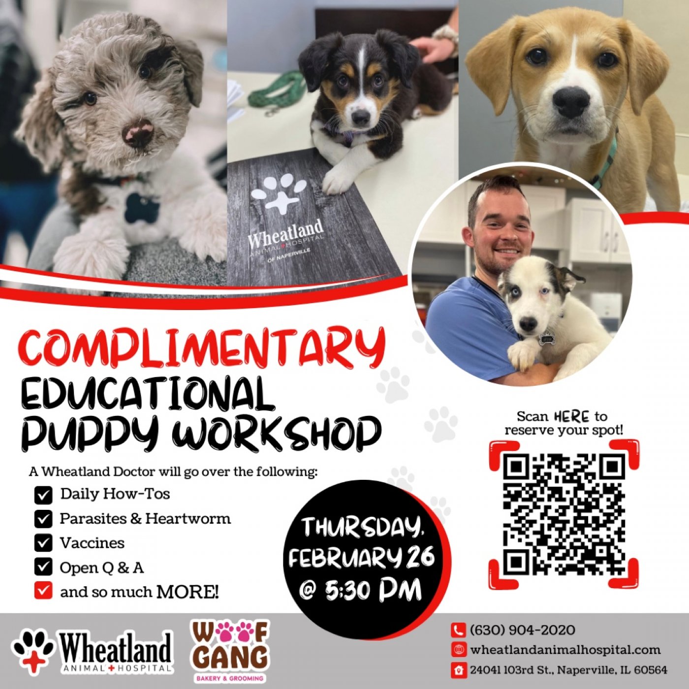 Join us for our (complimentary) 1-hour Educational Puppy Workshop on Thursday, February 26 at 5:30 pm! Whether you’re a first-time owner or just want to refresh your skills, we’ve got you! Meet us in the Wheatland Animal Hospital lobby with all your pet questions.