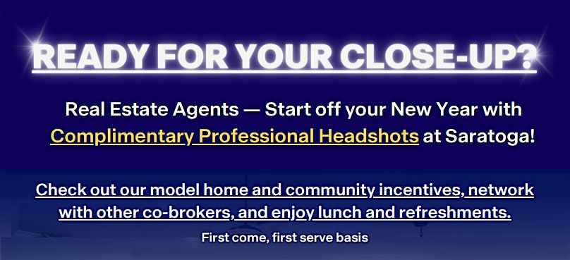 Join us on January 22nd for complimentary professional headshots at Saratoga. Check out our model home and community incentives, network with other co-brokers, and enjoy lunch and refreshments (first come, first serve basis).