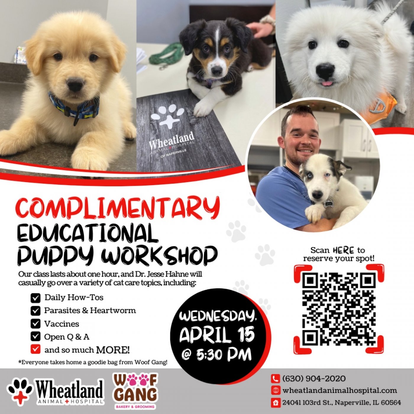 Join us for our complimentary 1-hour Educational Puppy Workshop on Wednesday, April 15 at 5:30 pm! Whether you’re a first-time owner or just want to refresh your skills, we’ve got you! Meet us in the Wheatland Animal Hospital lobby with all your pet questions.