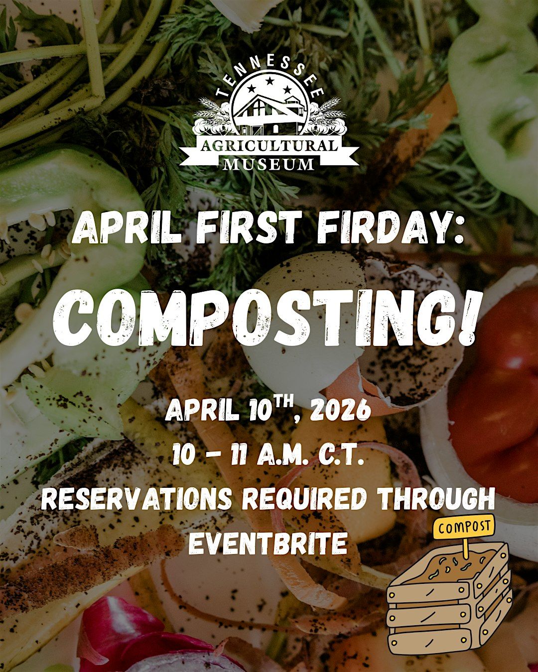 Come on down and learn all about composting! For the Tennessee Agricultural Museum's April First Friday program, we are thrilled to host Ms. Kay, a Nashville Master Gardener, as our guest speaker! She will teach our young learners how and why we should compost.