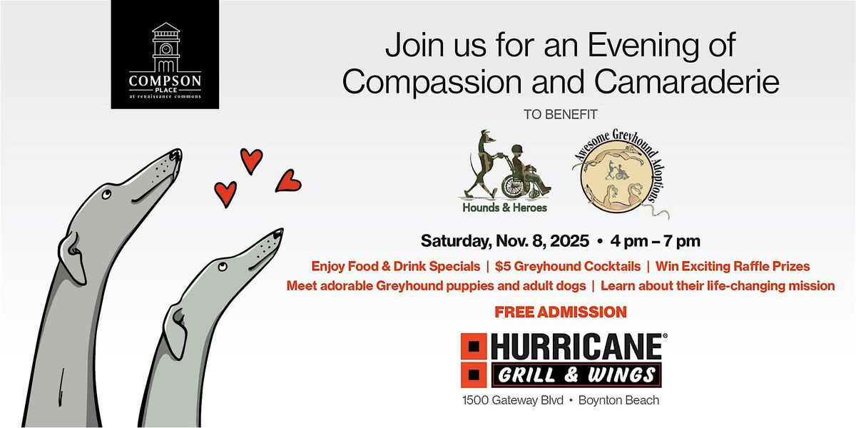 Compson Place at Renaissance Commons, 1880 N. Congress Avenue, and Hurricane Grill & Wings will host an evening to benefit a local charity, Awesome Greyhound Adoptions, on Saturday, November 8 from 4 p.m. to 7 p.m. Admission is free.
