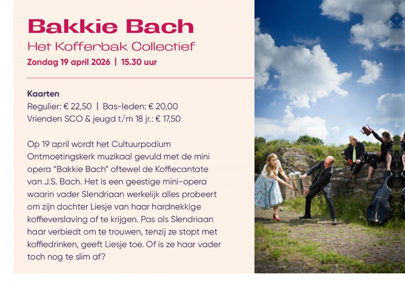 Op 19 april wordt het cultuurpodium Ontmoetingskerk te Bergen op Zoom muzikaal gevuld met de mini opera "Bakkie Bach" oftewel de Koffiecantate van J.S. Bach. Het is een geestige mini-opera waarin vader Slendriaan werkelijk alles probeert om zijn dochter Liesje van haar hardnekkige koffieverslaving af te krijgen. Pas als hij haar verbiedt om te trouwen, tenzij ze stopt met koffiedrinken, geeft Liesje toe. Of is ze haar vader te slim af? www.scoboz.nl