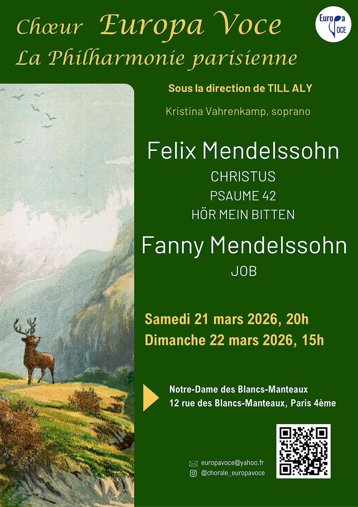 Ce concert est consacré à la famille Mendelssohn. Nous chanterons le Christus et les Psaumes 42 et 55 de Felix Mendelssohn ainsi qu'une oeuvre de la trop méconnue Fanny Hensel-Mendelssohn, soeur de Félix.