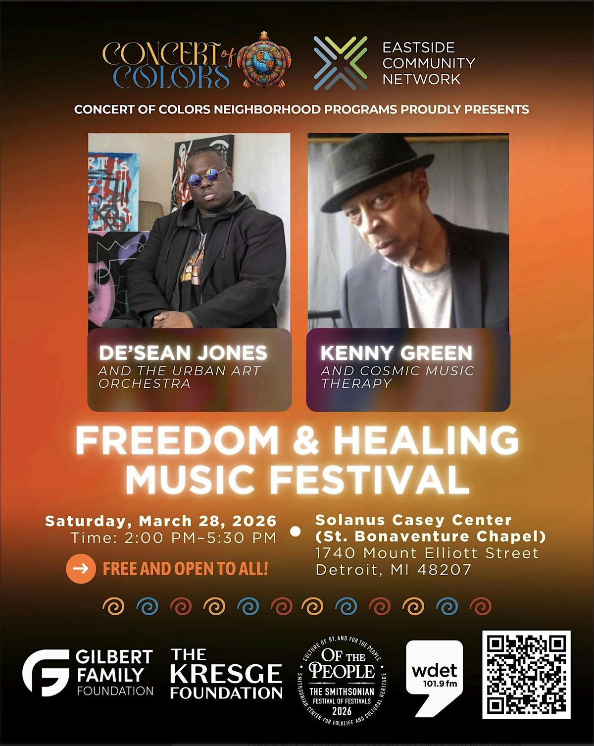 Presented by Concert of Colors Neighborhood Programs and The Eastside Community Network, this inspiring event features De’Sean Jones and the Urban Art Orchestra and Kenny Green and Cosmic Music Therapy.