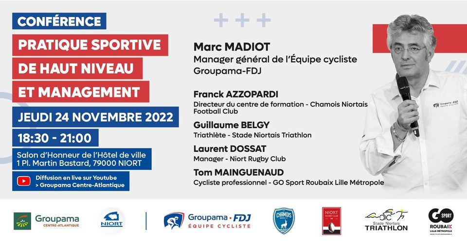 Groupama et la ville de Niort vous proposent une conférence sur le thème du management dans le sport de haut-niveau ! ??En présence de Marc Madiot, Manager Général de l'Équipe cycliste Groupama-FDJ ??♂️, il sera question d'évoquer deux thématiques principales.