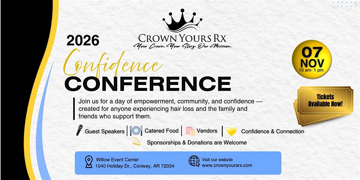 Welcome to the Confidence Conference 2026, presented by Crown Yours Rx! Join us on November 7, 2026, at 10:00 AM (Central Time) at The Willow Event Center, 1040 Holiday Drive, Conway, AR for a day filled with empowerment, inspiration, and growth.