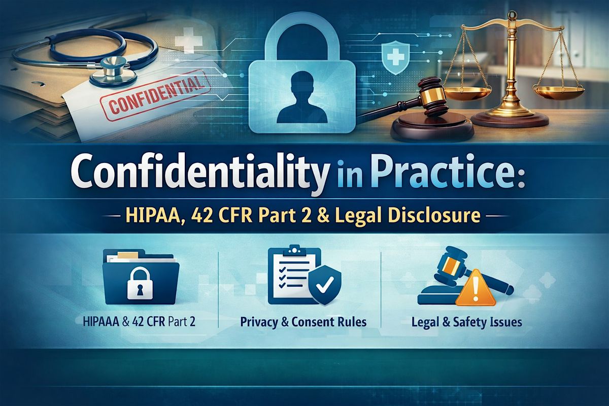 This workshop provides a practical overview of confidentiality in behavioral health practice, with focused attention on HIPAA, 42 CFR Part 2, and related legal and ethical standards. Participants will examine how confidentiality applies to clinical records, substance use treatment information, coordination of care, and safety-related disclosures. The training is designed to help professionals strengthen their understanding of privacy protections while making sound and compliant decisions in everyday practice.