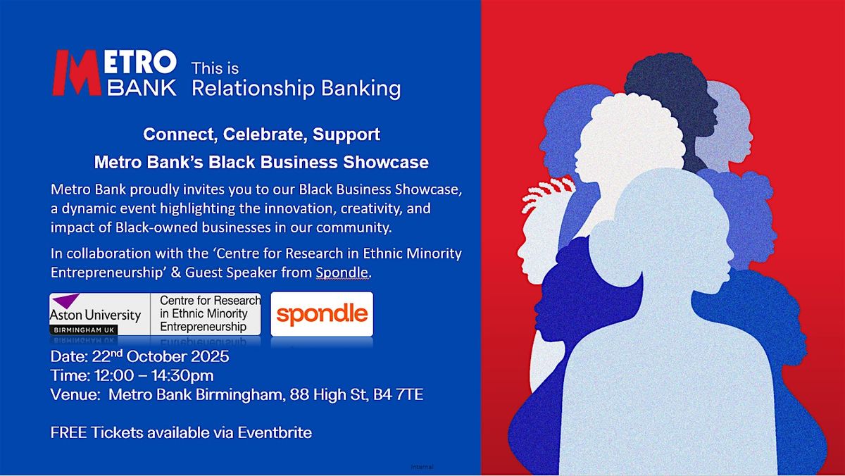 Welcome to Connect, Celebrate, Support - Metro Bank’s Black Business Showcase! Join us at Metro Bank for an afternoon of networking, insights, and support for black-owned businesses. This in-person event is a fantastic opportunity to meet fellow entrepreneurs, Business professionals and celebrate the black business community. Come together to connect with like-minded individuals, celebrate the achievements of black entrepreneurs, and support each other in our business endeavour's. Don't miss out on this exciting showcase – mark your calendars and get ready to be inspired!