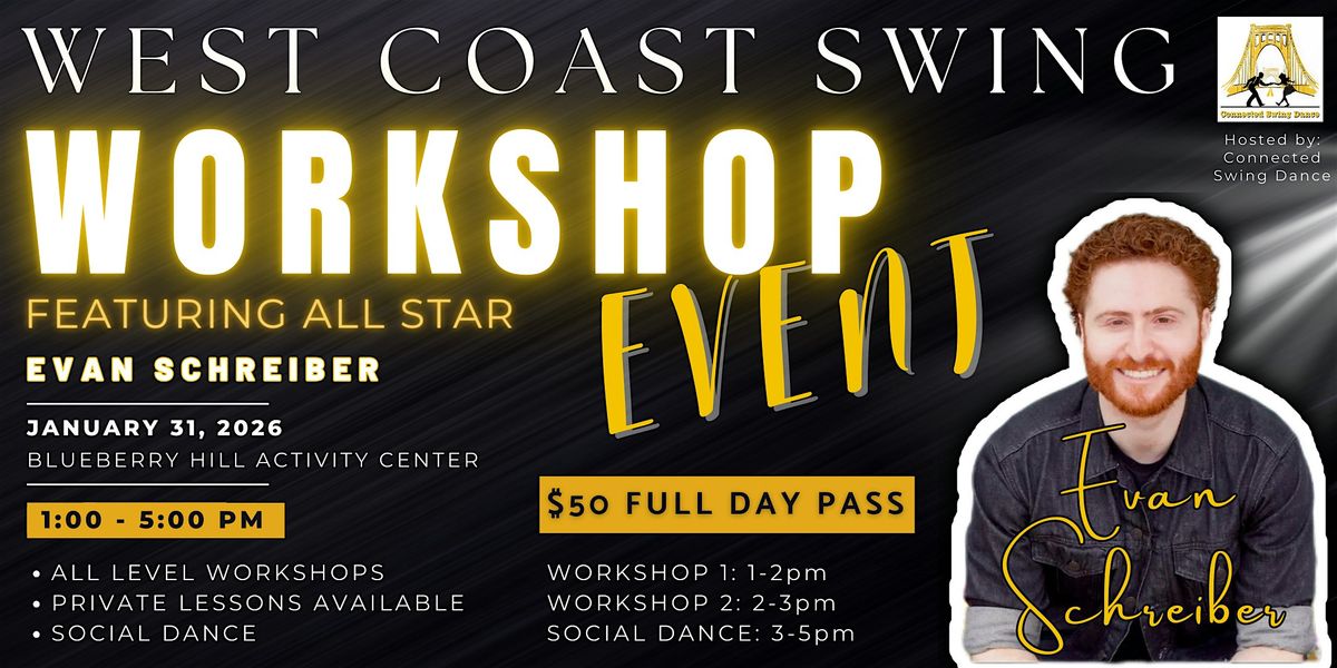 Connected Swing Dance is thrilled to have West Coast Swing All Star Leader and Advanced Follow Evan Schreiber teaching a special 2-hour Workshop with a 2-hour Social Dance afterwards on Saturday January 31, 2026 from 1-5pm. Workshops are designed for all levels of West Coast Swing dancers.