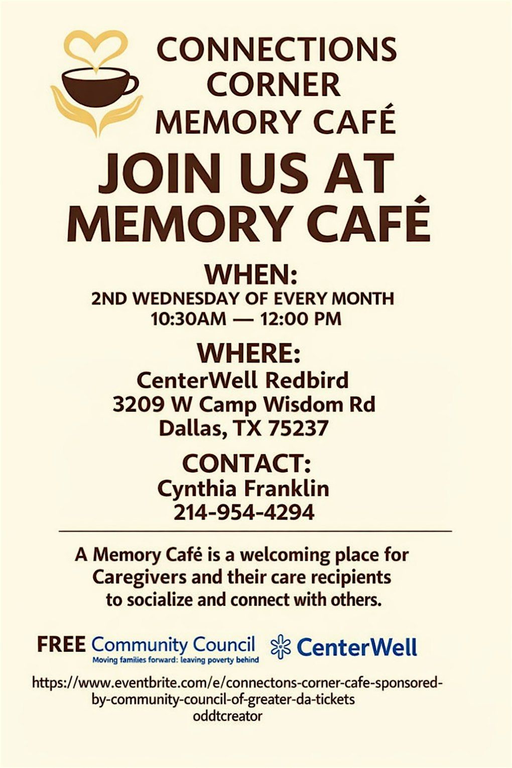 The Memory Café is a warm, dementia‑friendly space where all Caregivers and their care recipients come for socialization, fun, food and more