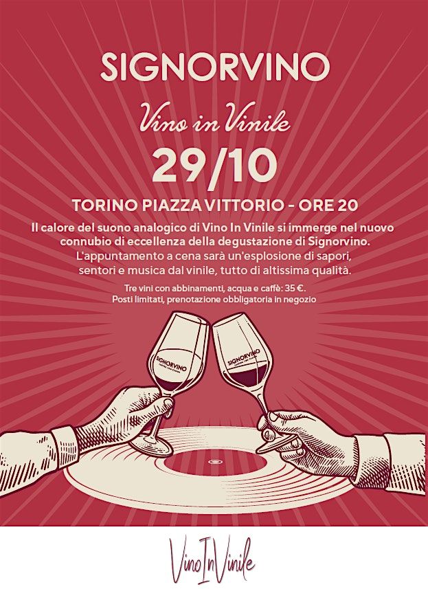 📅 Mercoledì 29 ottobre 2025 ore 20:00, nella suggestiva Piazza Vittorio a Torino, la magia del vinile incontra l’arte del vino nella cornice accogliente di Signorvino.