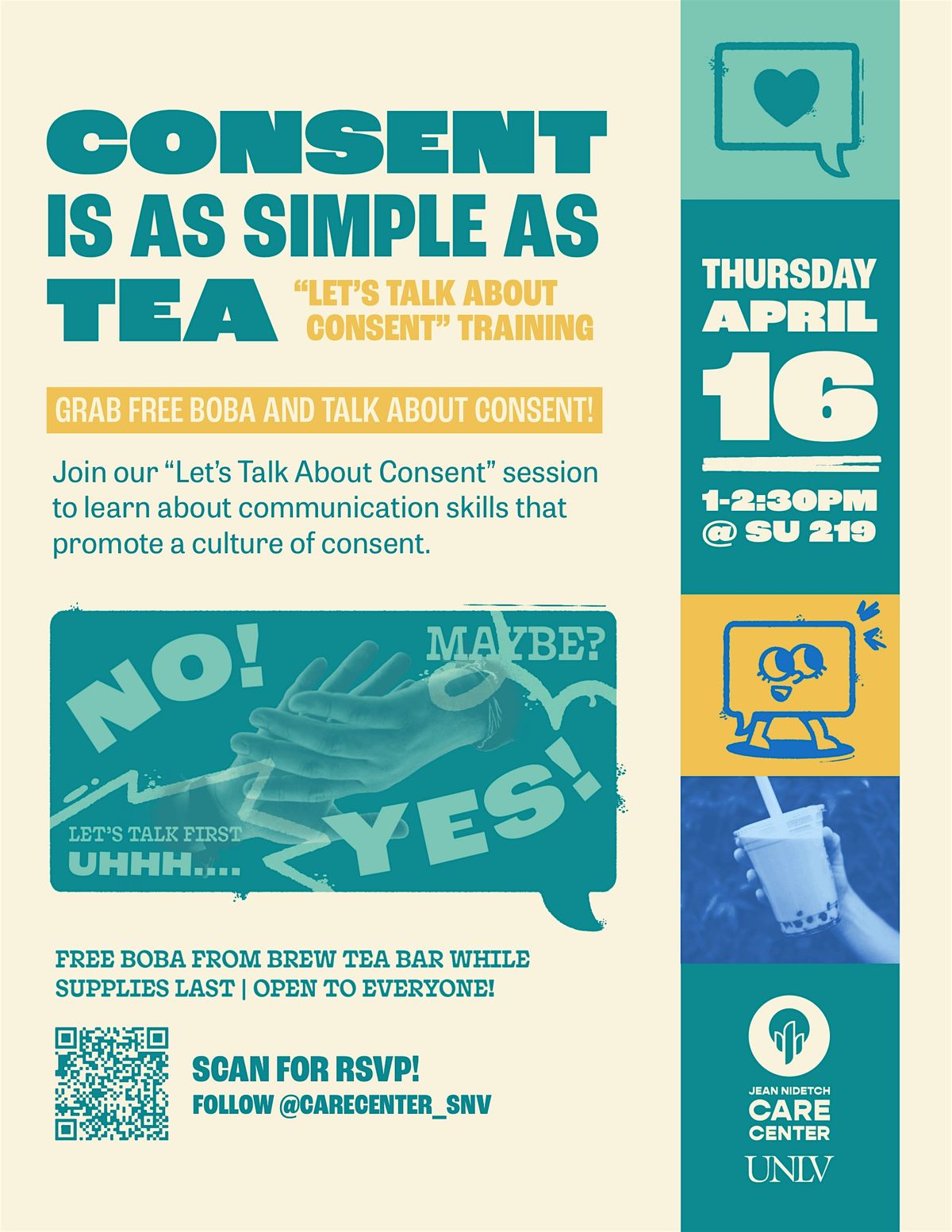Come for the free boba and stay for a meaningful conversation on consent, communication, and knowing your rights. Our interactive presentation will break down what consent looks like, when it’s not present, and share Care Center resources. Bring a friend and be part of the conversation!