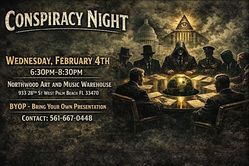 Join us for Conspiracy Night, an in-person evening of open discussion, independent research, and community dialogue. This is a collaborative forum where attendees are invited to bring their own presentations, ideas, or questions and engage in respectful conversation around unconventional topics and alternative perspectives.