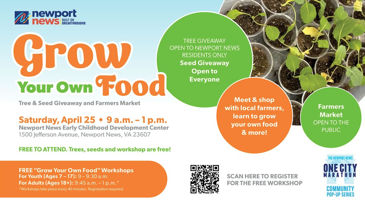 Ever wanted to start a garden but don’t have the space or aren’t sure where to start? Want to save money on groceries? Attend the Grow Your Own Food Workshop, Container Garden Giveaway and Farmers’ Market event on Sat., April 25 at the Newport News Early Childhood Development Center - 1500 Jefferson Ave.