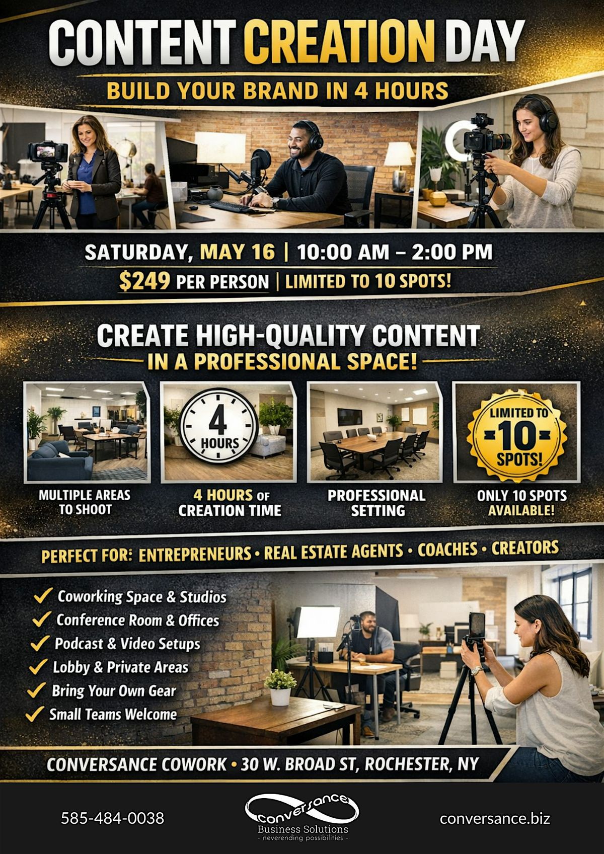 Elevate your brand with Content Creation Day at Conversance CoWork, a focused 4-hour session designed for entrepreneurs, business owners, and content creators who want to produce high-quality, professional content.