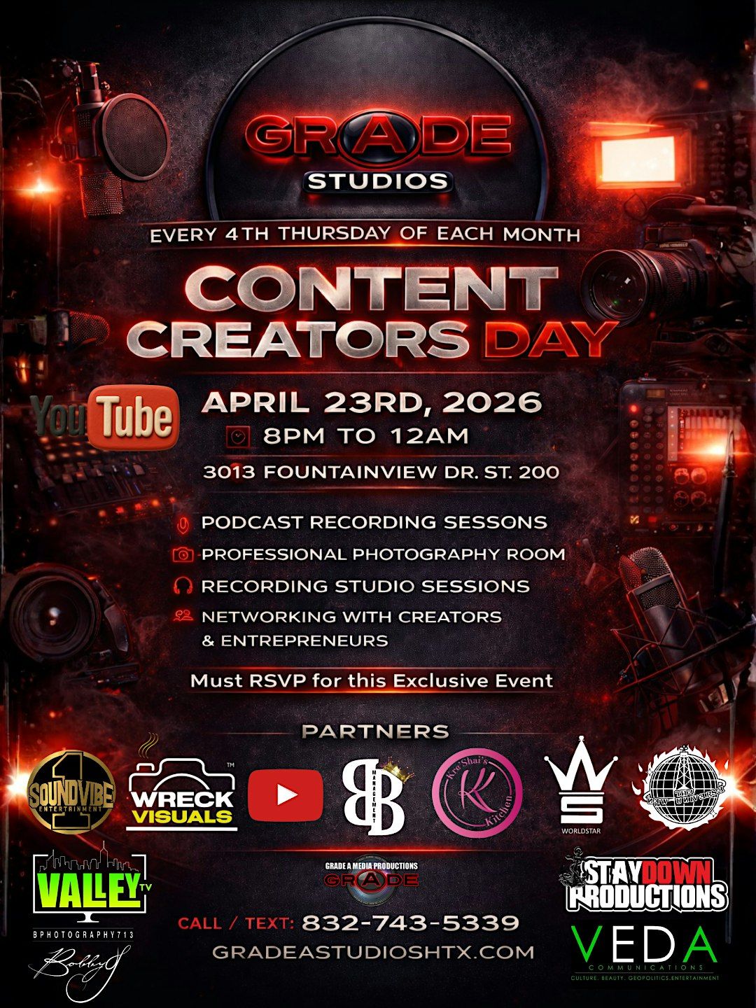 Join us for Content Creators Day, happening every 4th Thursday of the month at Grade A Studiosβyour go-to space for creativity, collaboration, and content production.