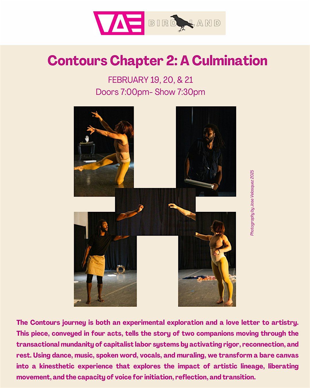 The Contours journey is both an experimental exploration and a love letter to artistry. This piece, conveyed in four acts, tells the story of two companions moving through the transactional mundanity of capitalist labor systems by activating rigor, reconnection, and rest. Using dance, music, spoken word, vocals, and muraling, we transform a bare canvas into a kinesthetic experience that explores the impact of artistic lineage, liberating movement, and the capacity of voice for initiation, reflection, and transition.
