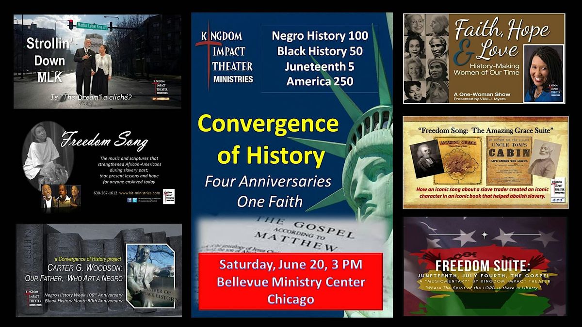 Kingdom Impact Theater Ministries climaxes its six-month festival of shows connecting Christianity, Black history and U.S. history, in "Convergence of History: Four Anniversaries, One Faith," on Saturday, June 20, 3 PM at the Bellevue Ministry Center, Chicago.