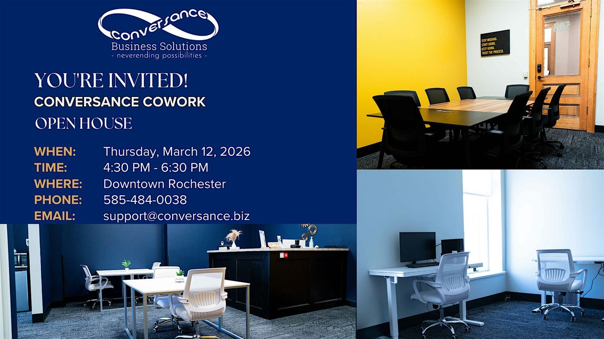 Join us for an Open House at Conversance CoWork, a professional coworking environment designed to support entrepreneurs, small business owners, and creative professionals. Taking place on March 12 from 4:30–6:30 PM in Downtown Rochester, this event offers an opportunity to tour the space, connect with fellow business owners, and learn more about our coworking memberships, virtual office solutions, and meeting spaces. Light refreshments will be provided as you explore how Conversance CoWork can support your business growth and productivity.