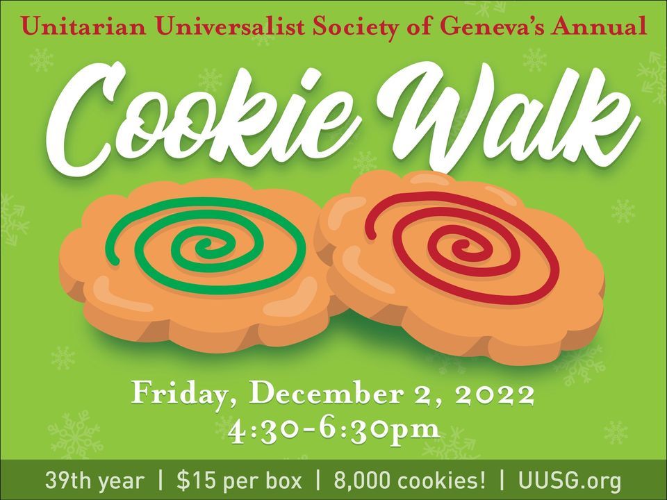 One of Geneva’s oldest and sweetest holiday traditions returns for its 39th year when the Unitarian Universalist Society of Geneva (UUSG) hosts its annual Cookie Walk on Fri., Dec. 2, 2022 from 4:30 p.m. to 6:30 p.m.Held in conjunction with the city’s popular Christmas Walk celebration, the Cookie Walk fundraiser offers a wide array of festive holiday cookies, home-made by church members. Elves will be paired up with each guest, walking them through Cookie Lane, filling the box as they go. Cookie Walk guests choose around two dozen cookies and Elves box them.